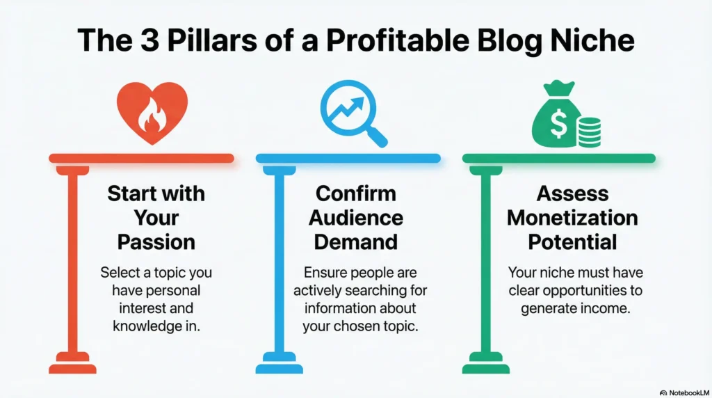 Before creating content, selecting the right blog niche determines your long-term blogging success. Your niche should balance three factors: